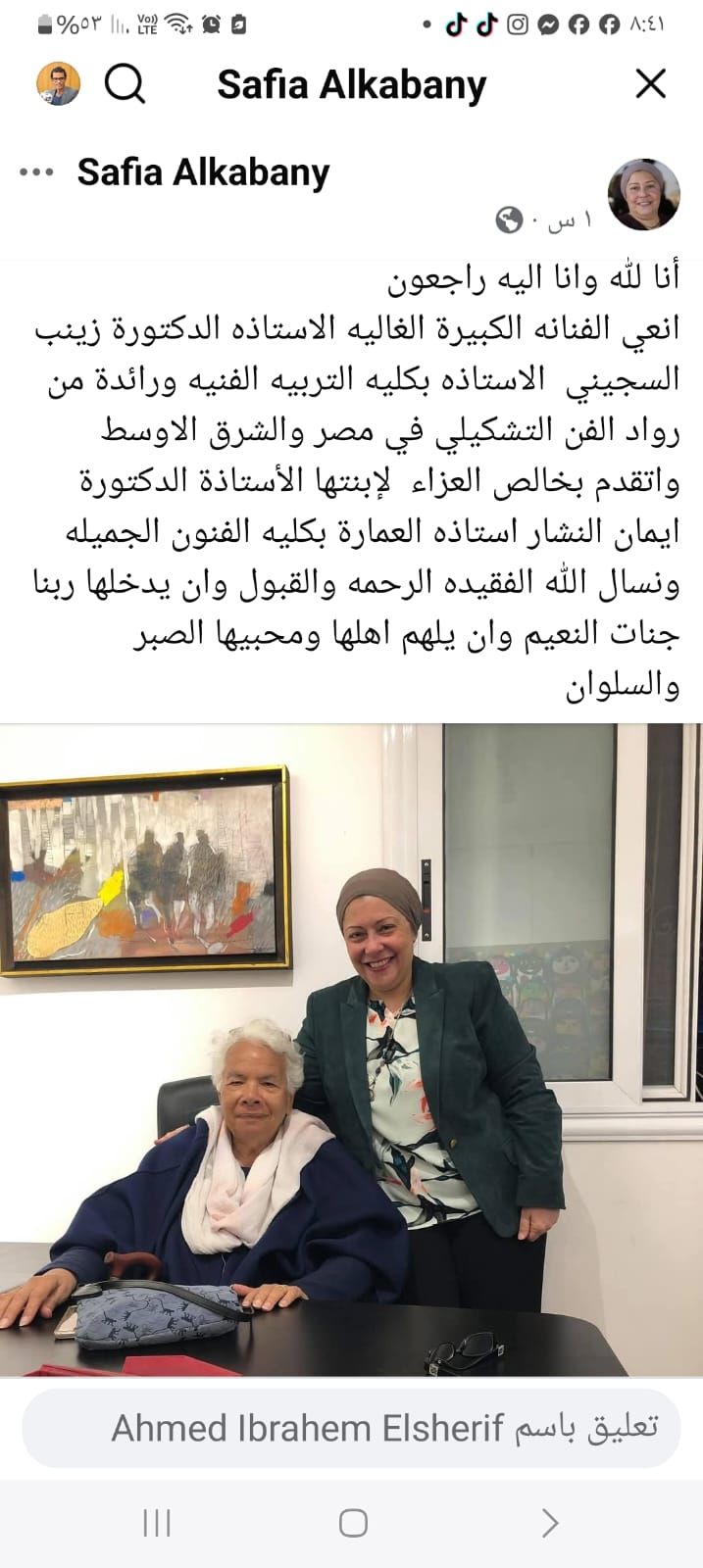 رحلت عن عالمنا الفنانة التشكيلية الكبيرة الأستاذة الدكتورة زينب السجيني، أستاذة بكلية التربية الفنية، وإحدى رائدات الفن التشكيلي في مصر والشرق الأوسط، تاركة خلفها مسيرة فنية حافلة بالعطاء والإبداع، حسبما كتبت الدكتورة صفية القباني، على صفحتها الخاصة على الفيس بوك.