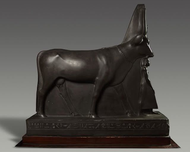 يصور التمثال المعبود حتحور في هيئتها الحيوانية كبقرة مقدسة، وهي تبسط حمايتها على "بسماتيك"، أحد كبار رجال الدولة وحاكم القصر والمشرف على الأختام. تم اكتشاف هذا الأثر في جبانة منف بسقارة، ليكون شاهداً على مدرسة فنية أعادت إحياء تقاليد الدولة القديمة، حيث الأسطح المستديرة والخطوط الانسيابية التي تتحدى صلابة الحجر.