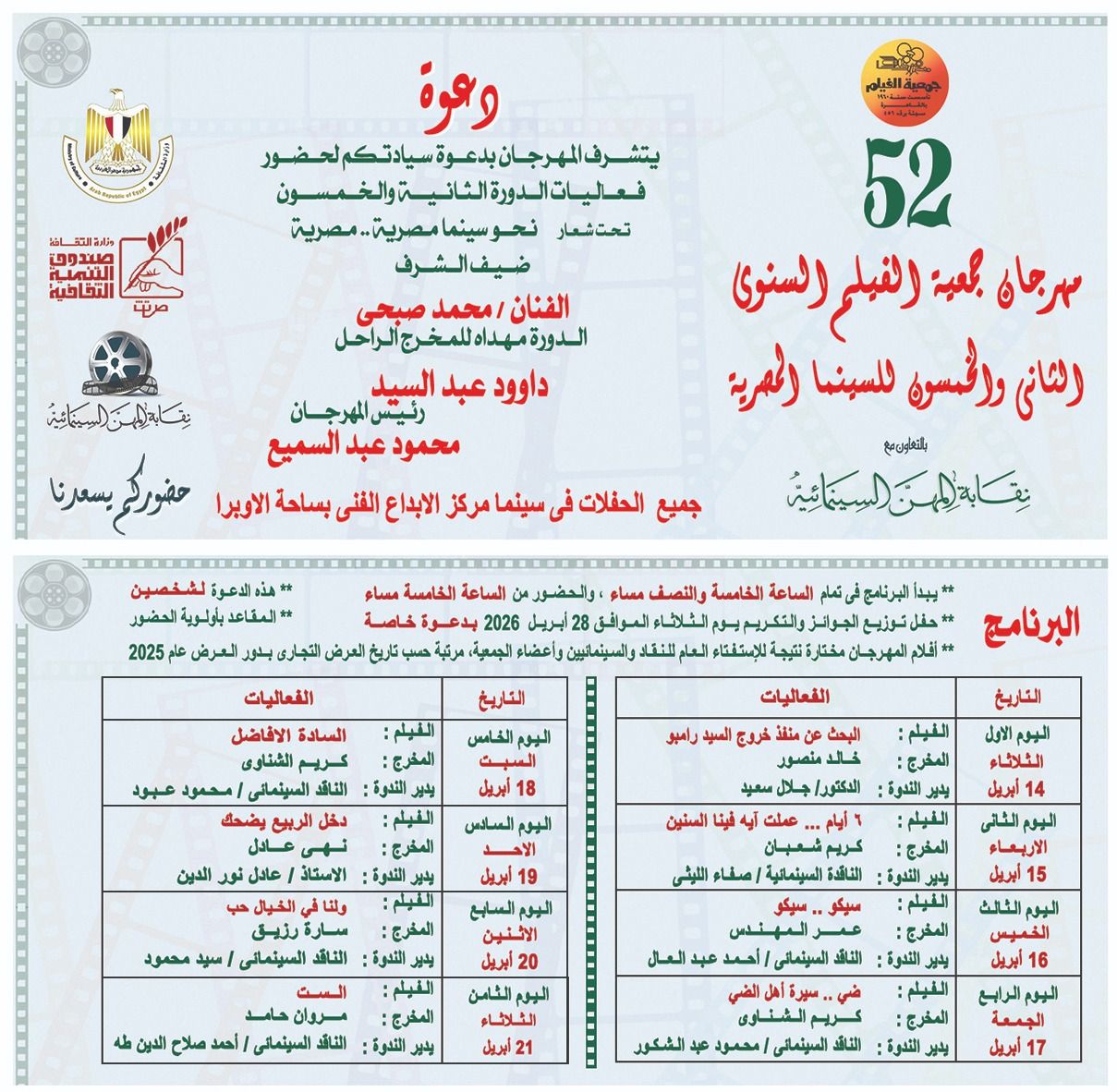 تُهدى الدورة إلى روح المخرج داوود عبد السيد، ويحل الفنان محمد صبحي ضيف شرف، فيما يضم البرنامج 8 أفلام من إنتاج 2025، تم اختيارها وفق الاستفتاء السنوي للنقاد والسينمائيين وأعضاء الجمعية، في تقليد يميز المهرجان عن غيره.