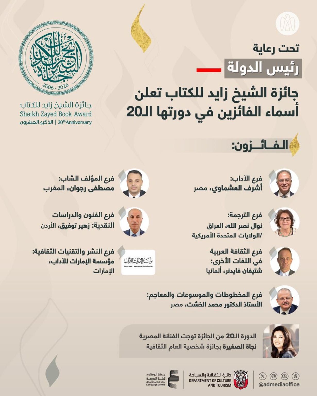 كما منحت الجائزة في دورتها العشرين لقب شخصية العام الثقافية للفنانة المصرية نجاة الصغيرة، تقديراً لمسيرتها الفنية وإسهاماتها في الثقافة العربية.
