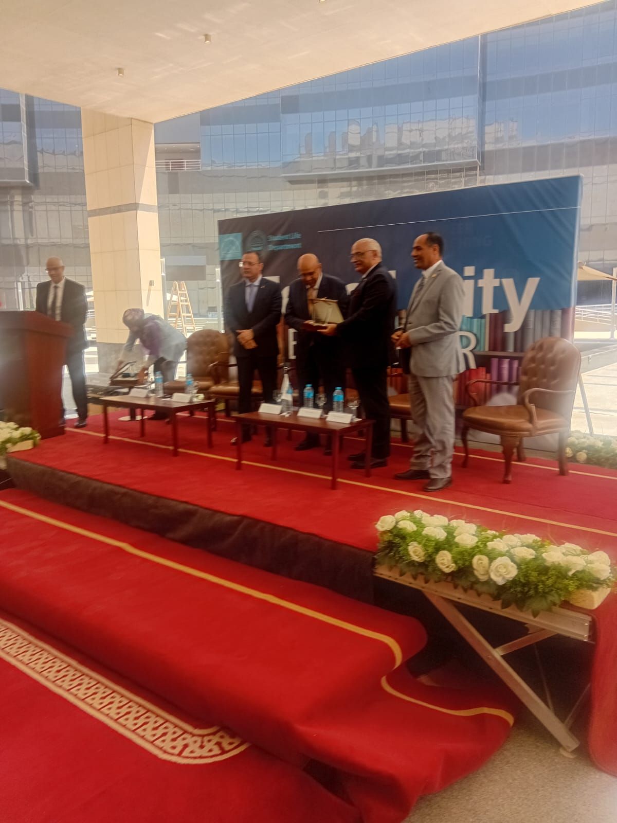 وعلى هامش الافتتاح، تم تكريم الدكتورة جيهان زكي بإهدائها درع مدينة زويل، تسلمه نيابة عنها المهندس محمد أبو سعدة، الذي نقل بدوره تحيات الوزيرة واعتذارها عن عدم الحضور، مؤكدًا حرص وزارة الثقافة على إتاحة الكتاب كأحد أهم مصادر المعرفة، خاصة لطلاب الجامعات، بما يسهم في بناء وعيهم العلمي والثقافي.