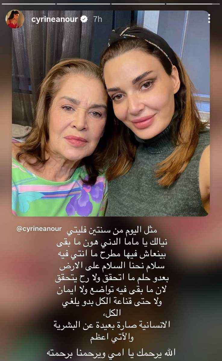 وقالت سيرين لوالدتها: "مثل اليوم من سنتين فليتي. نيالك يا ماما الدني هون ما بقى بينعاش فيها، مطرح ما انتي فيه سلام، ونحنا السلام على الارض بعده حلم ما اتحقق ولا رح يتحقق لان ما بقى فيه تواضع ولا ايمان ولا حتى قناعة، الكل بده يلغي الكل".