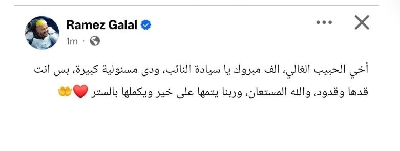 شارك رامز، محبيه منشورًا عبر حسابه الرسمي بموقع “فيس بوك”، قائلًا: “أخي الحبيب الغالي، الف مبروك يا سيادة النائب، ودي مسؤولية كبيرة، بس انت قدها وقدود والله المستعان، وربنا يتمها علي خير ويكملها بالستر”.