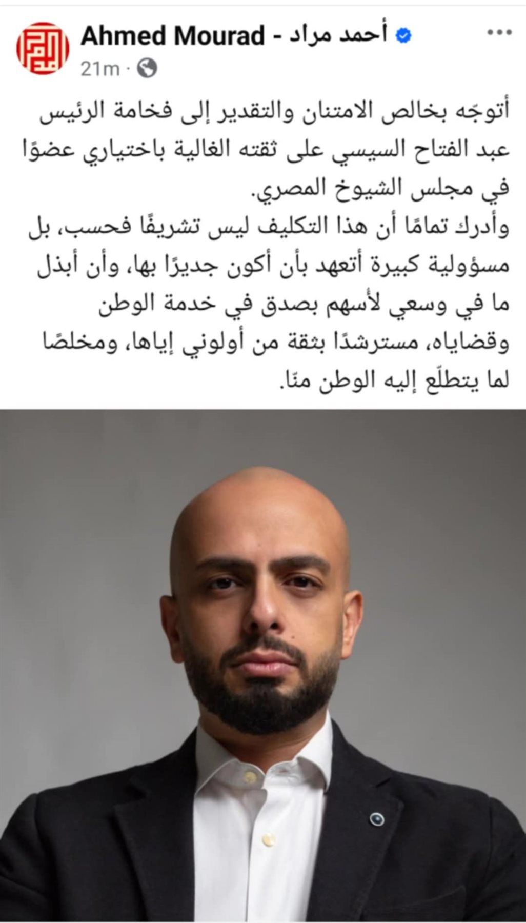 وعلق الكاتب أحمد مراد على قرار تعيينه بمجلس الشيوخ "أتوجّه بخالص الامتنان والتقدير إلى الرئيس عبد الفتاح السيسي على ثقته الغالية باختياري عضوًا في مجلس الشيوخ المصري".