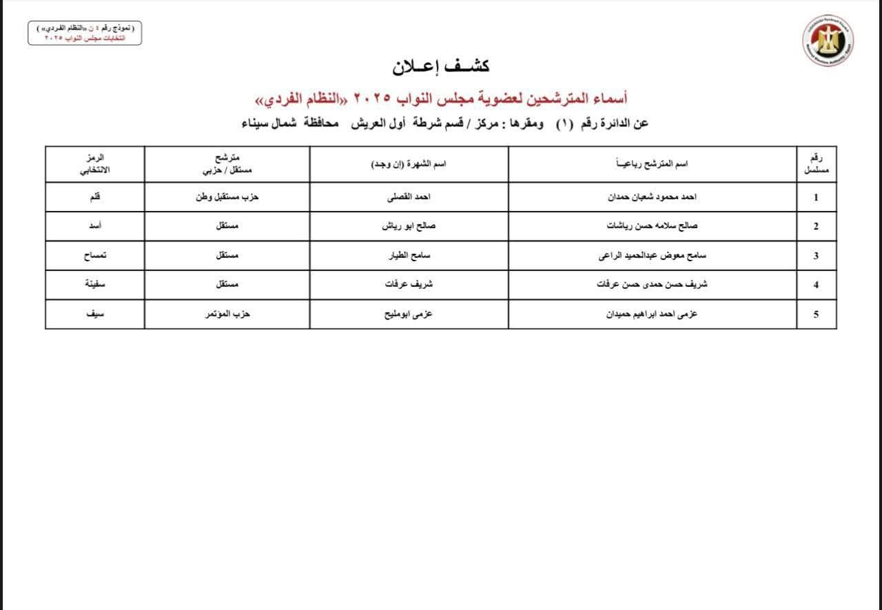 أعلنت الهيئة الوطنية للانتخابات، برئاسة القاضي حازم بدوي، أسماء المرشحين على مقاعد الفردي بدوائر محافظة شمال سيناء لانتخابات مجلس النواب 2025، والتي جاءت كالتالي: