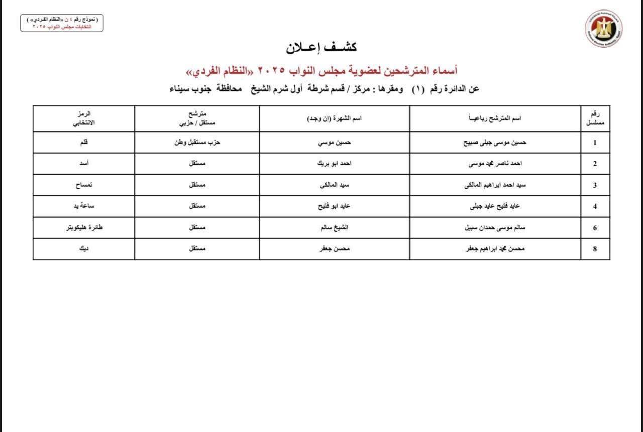 أعلنت الهيئة الوطنية للانتخابات، برئاسة القاضي حازم بدوي، أسماء المرشحين على مقاعد الفردي بدوائر محافظة جنوب سيناء لانتخابات مجلس النواب 2025، والتي جاءت كالتالي: