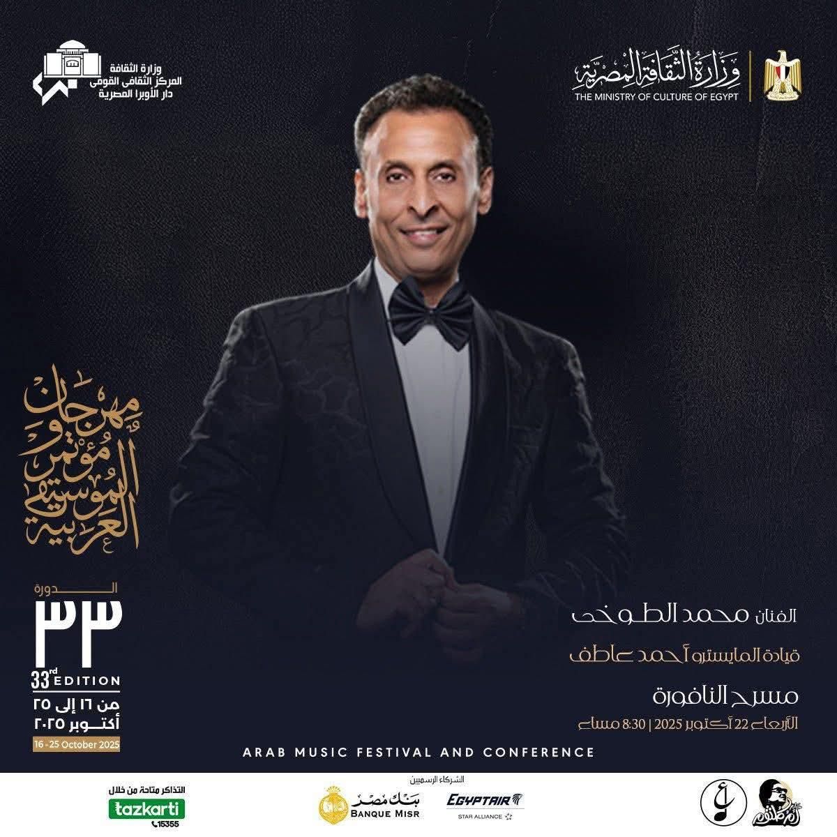 تواصل دار الاوبرا المصرية فعاليات مهرجان ومؤتمر الموسيقى العربية 33 برئاسة الدكتور علاء عبد السلام ويديره المايسترو تامر غنيم ونائبه المايسترو الدكتور محمد الموجى بإشراف أمانى السعيد مستشار رئيس الأوبرا حيث يقام فى التاسعة مساء الأربعاء 22 اكتوبر حفلا على مسرح النافورة.
