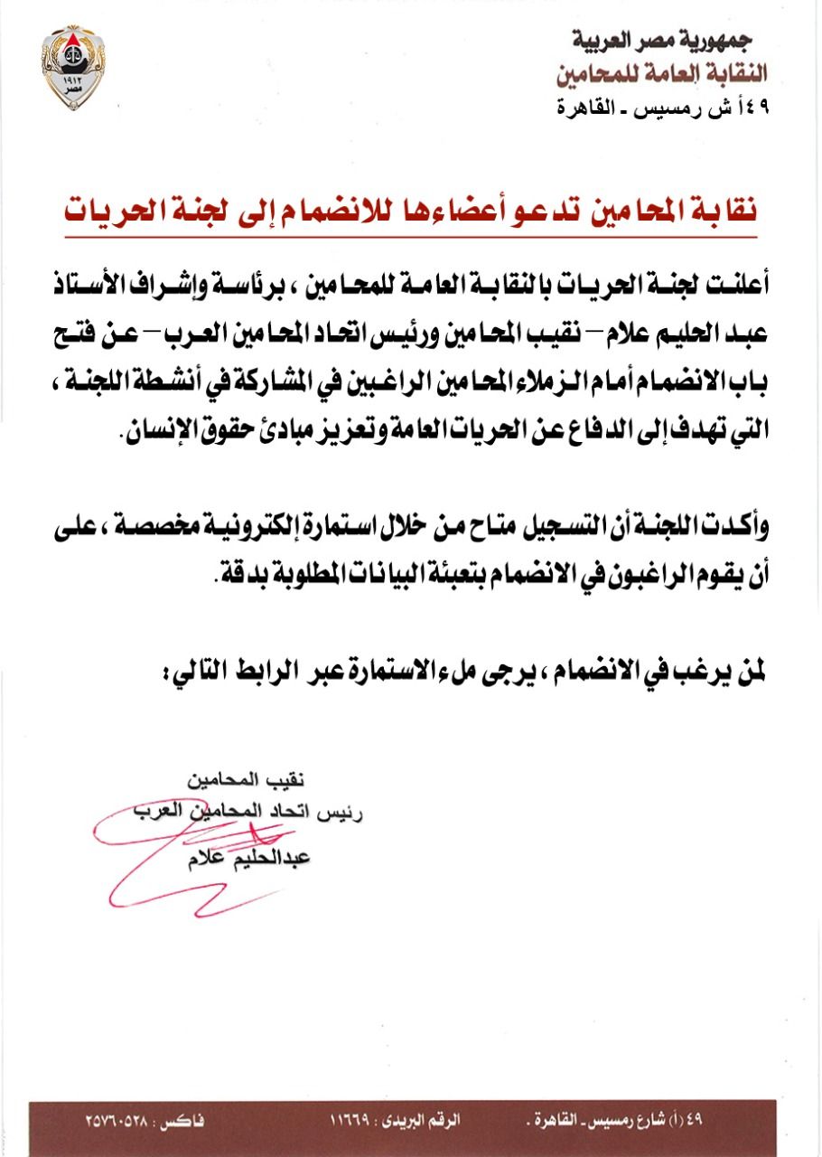 أعلنت لجنة الحريات بالنقابة العامة للمحامين، برئاسة وإشراف الأستاذ عبد الحليم علام – نقيب المحامين ورئيس اتحاد المحامين العرب – عن فتح باب الانضمام أمام الزملاء الراغبين في المشاركة في أنشطة اللجنة، التي تهدف إلى الدفاع عن الحريات العامة وتعزيز مبادئ حقوق الإنسان.