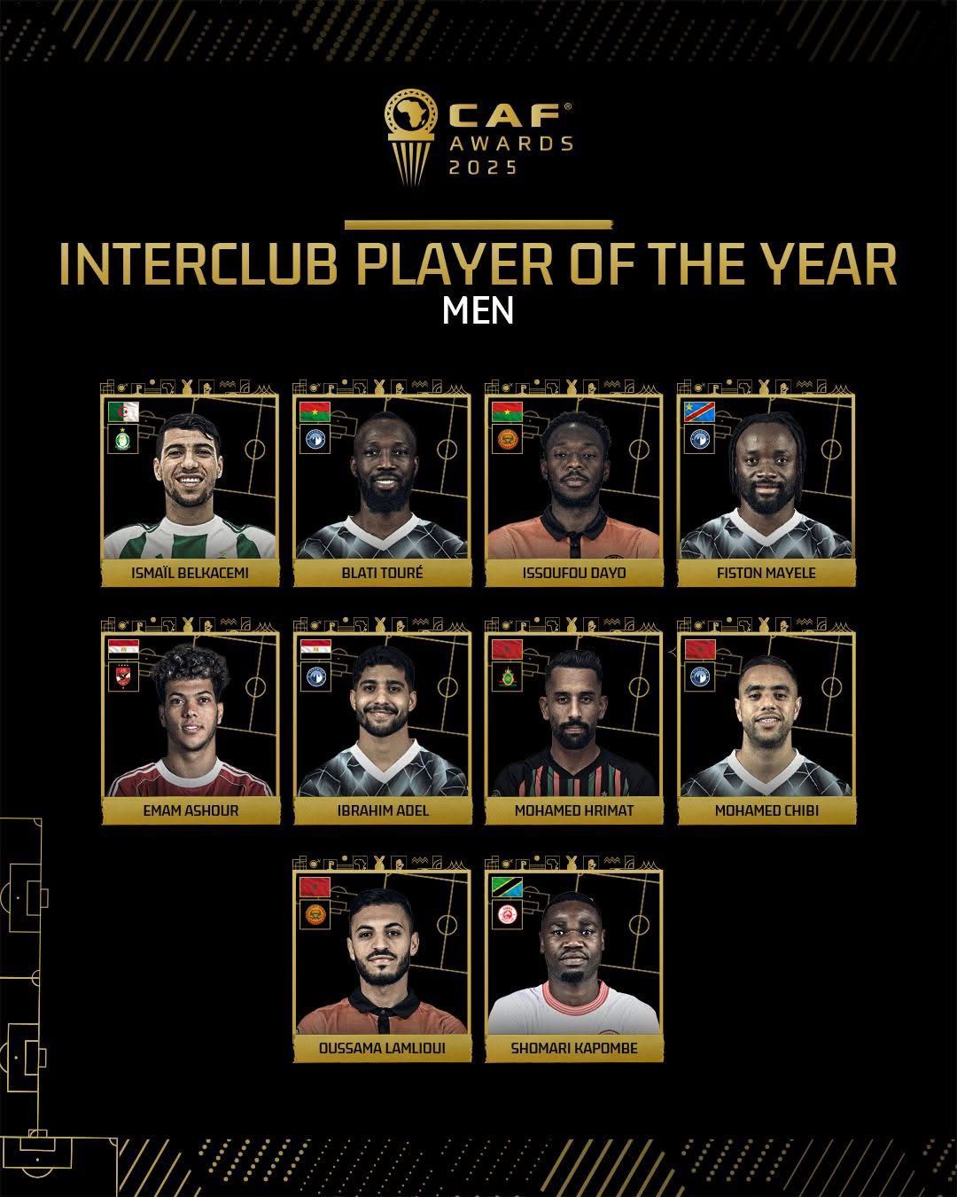 أعلن الاتحاد الأفريقي لكرة القدم، كاف، قائمة تضم 10 لاعبين مرشحين للفوز بجائزة أفضل لاعب داخل القارة لعام 2025، في حفل جوائز الكاف.