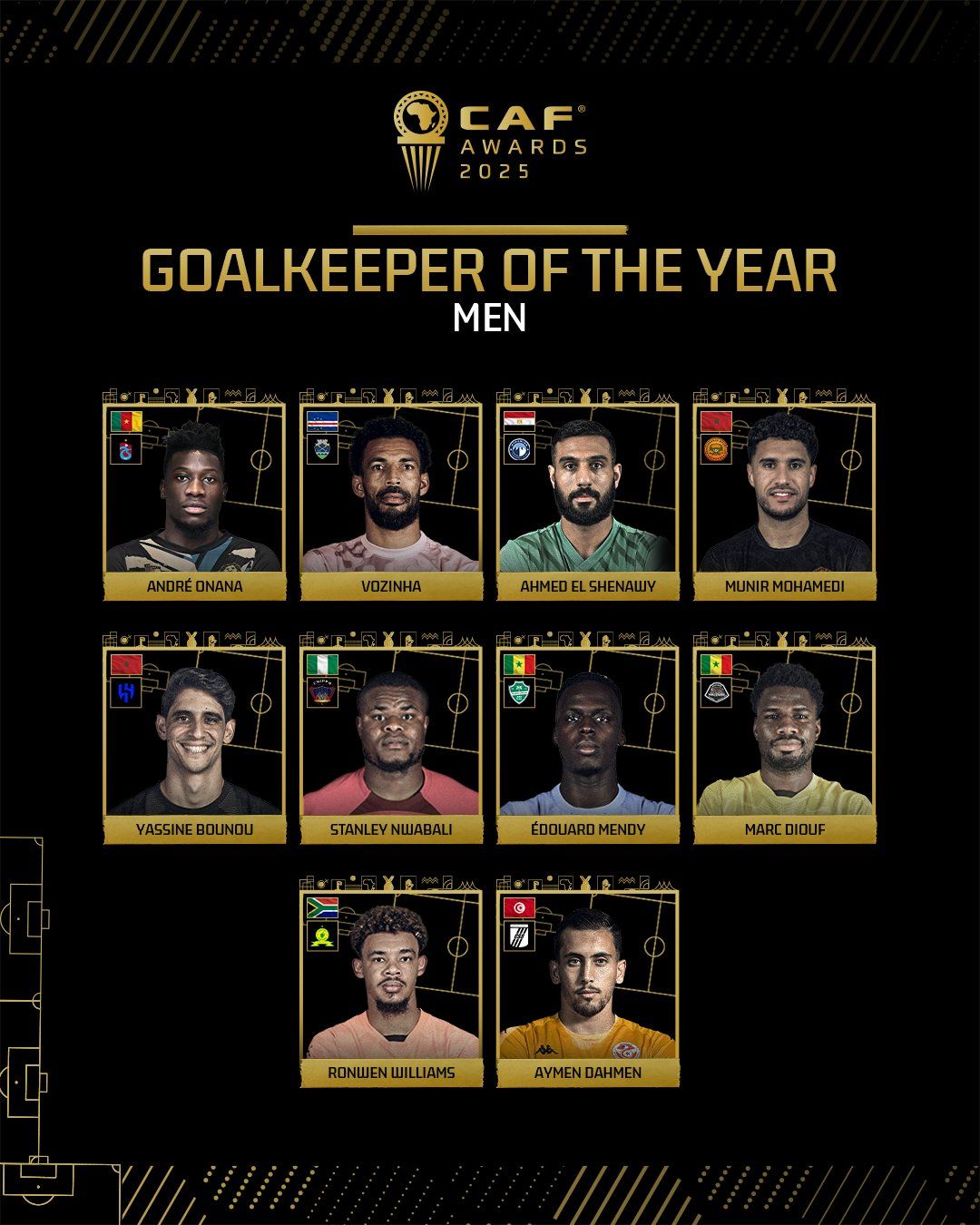 أعلن الاتحاد الإفريقي لكرة القدم (كاف) عن القائمة المرشحة لجائزة أفضل حارس مرمى في إفريقيا لعام 2025، والتي شهدت تواجد الحارس المصري أحمد الشناوي، نجم نادي بيراميدز، بعد موسم تاريخي قدّمه مع فريقه على المستويين المحلي والقاري.