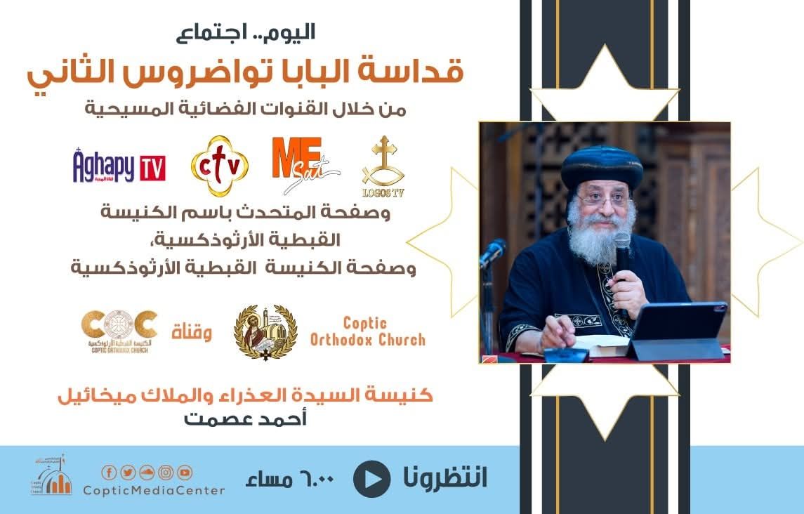 وتبث العظة عبر القنوات الفضائية المسيحية وقناة C.O.C التابعة للمركز الإعلامي للكنيسة على شبكة الإنترنت. وجاء ذلك الإعلان عبر الصفحة الرسمية للمتحدث الرسمي للكنيسة القبطية الأرثوذكسية، ومن المقرر أن يشارك قداسته الصلوات عدد من الآباء الأساقفة والآباء الكهنة، بجانب حضور شعبي غفير.