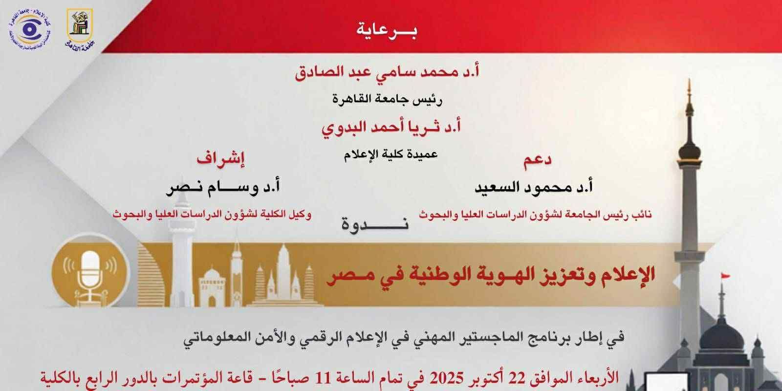 نظّمت كلية الإعلام بجامعة القاهرة، اليوم الأربعاء، ندوة علمية بعنوان "الإعلام وتعزيز الهوية الوطنية في مصر"، وذلك تحت رعاية الأستاذ الدكتور محمد سامي عبد الصادق، رئيس جامعة القاهرة، والأستاذة الدكتورة ثريا أحمد البدوي، عميدة كلية الإعلام، ضمن أنشطة برنامج الماجستير المهني في الإعلام الرقمي والأمن المعلوماتي.