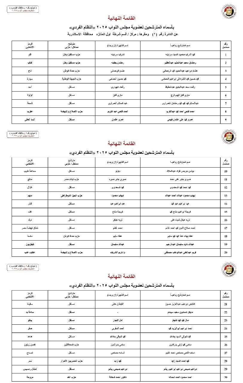 جاءت كشوف مرشحي النظام الفردي في محافظة الإسكندرية كالآتي: