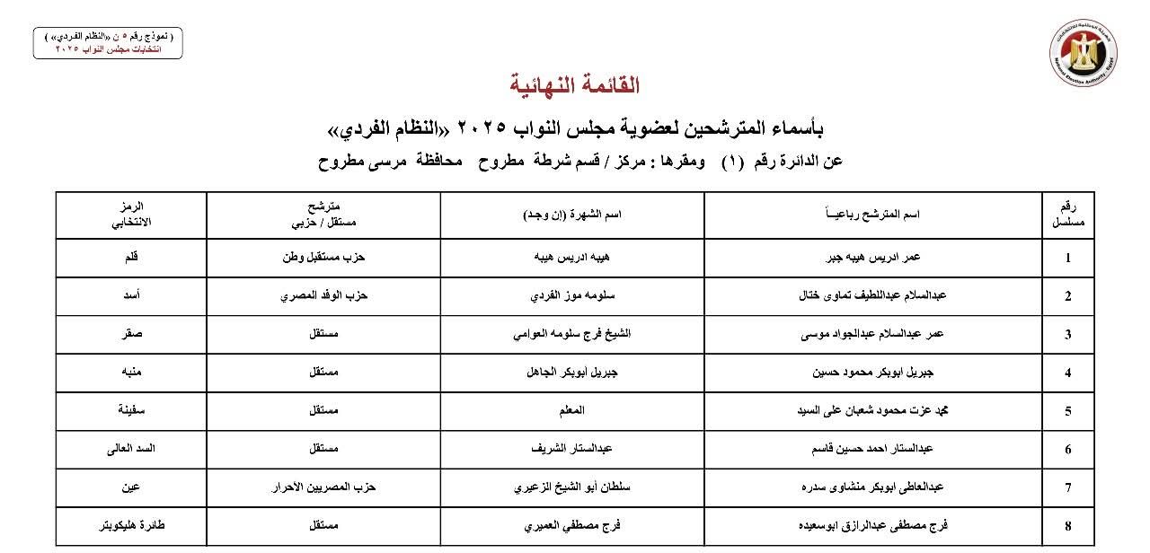 جاءت كشوف مرشحي النظام الفردي في محافظة مطروح كالآتي: