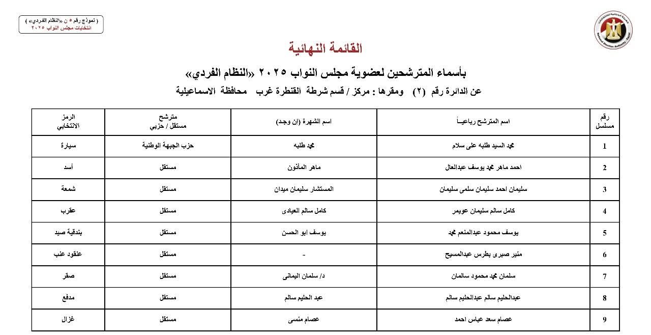 وجاءت كشوف مرشحي النظام الفردي في محافظة الإسماعيلية كالآتي: