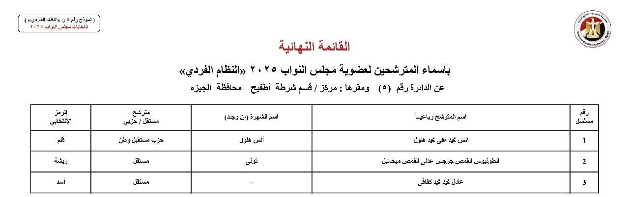 وجاءت كشوف مرشحي النظام الفردي في محافظة الجيزة كالآتي: