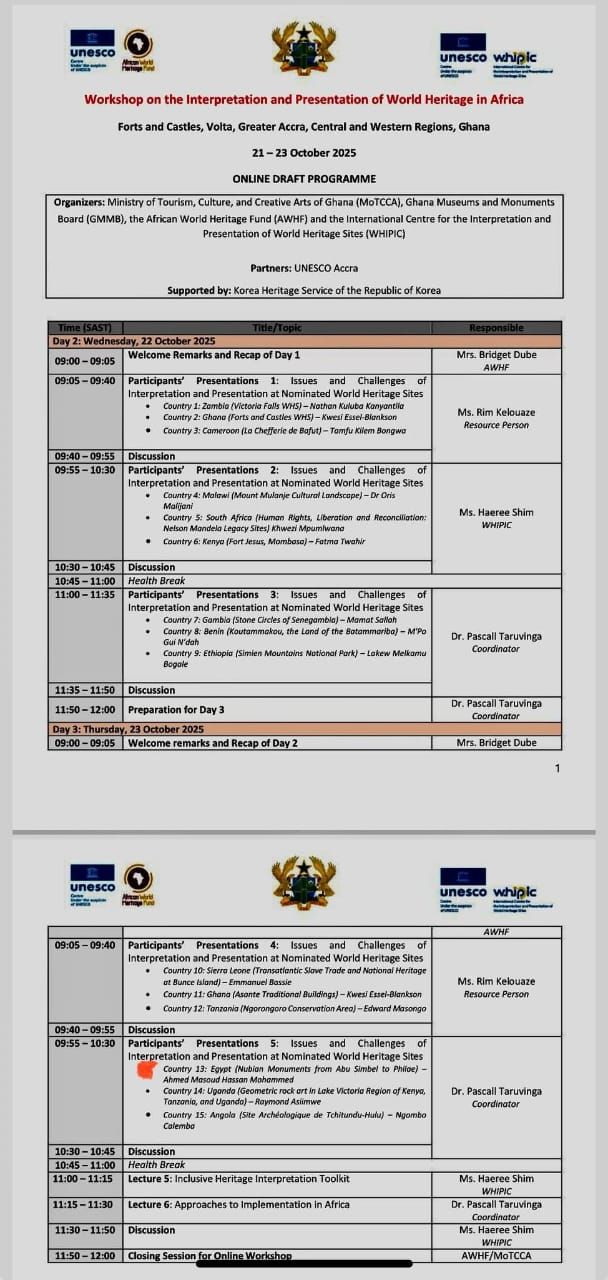 شارك مدير آثار أبو سمبل، الأثرى الدكتور أحمد مسعود، فى فعاليات ورشة العمل الإقليمية حول تفسير وعرض التراث العالمى فى أفريقيا، والتى نظمتها وزارة السياحة والثقافة والفنون الإبداعية بدولة غانا، بالتعاون مع صندوق التراث العالمى الأفريقى (AWHF) والمركز الدولى لتفسير وعرض مواقع التراث العالمى (WHIPIC)، خلال الفترة من 21 إلى 23 أكتوبر 2025، بدعم من هيئة التراث الكورية، وبشراكة مع منظمة اليونسكو – مكتب أكرا.