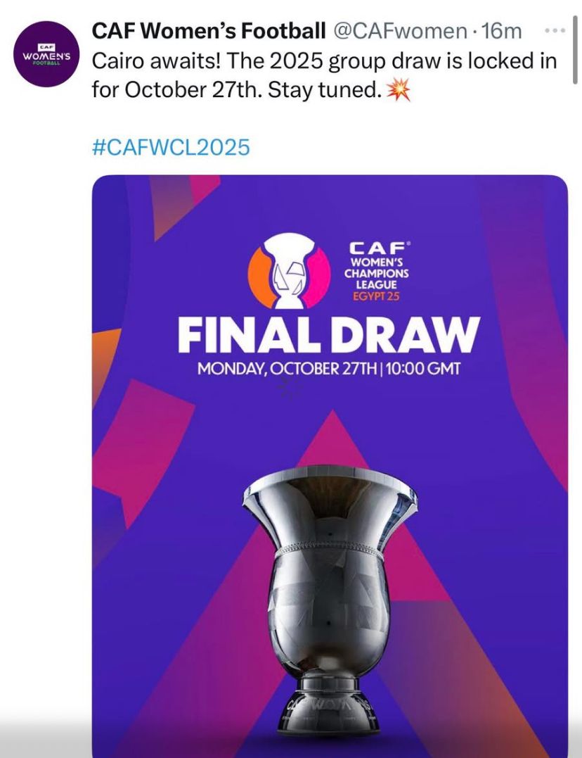 أعلن الاتحاد الإفريقي لكرة القدم (كاف) رسميًا إقامة النسخة المقبلة من بطولة دوري أبطال إفريقيا للسيدات 2025 في مصر، لتعود البطولة القارية الكبرى إلى أرض الفراعنة بعد سنوات من تنظيمها في دول مختلفة.