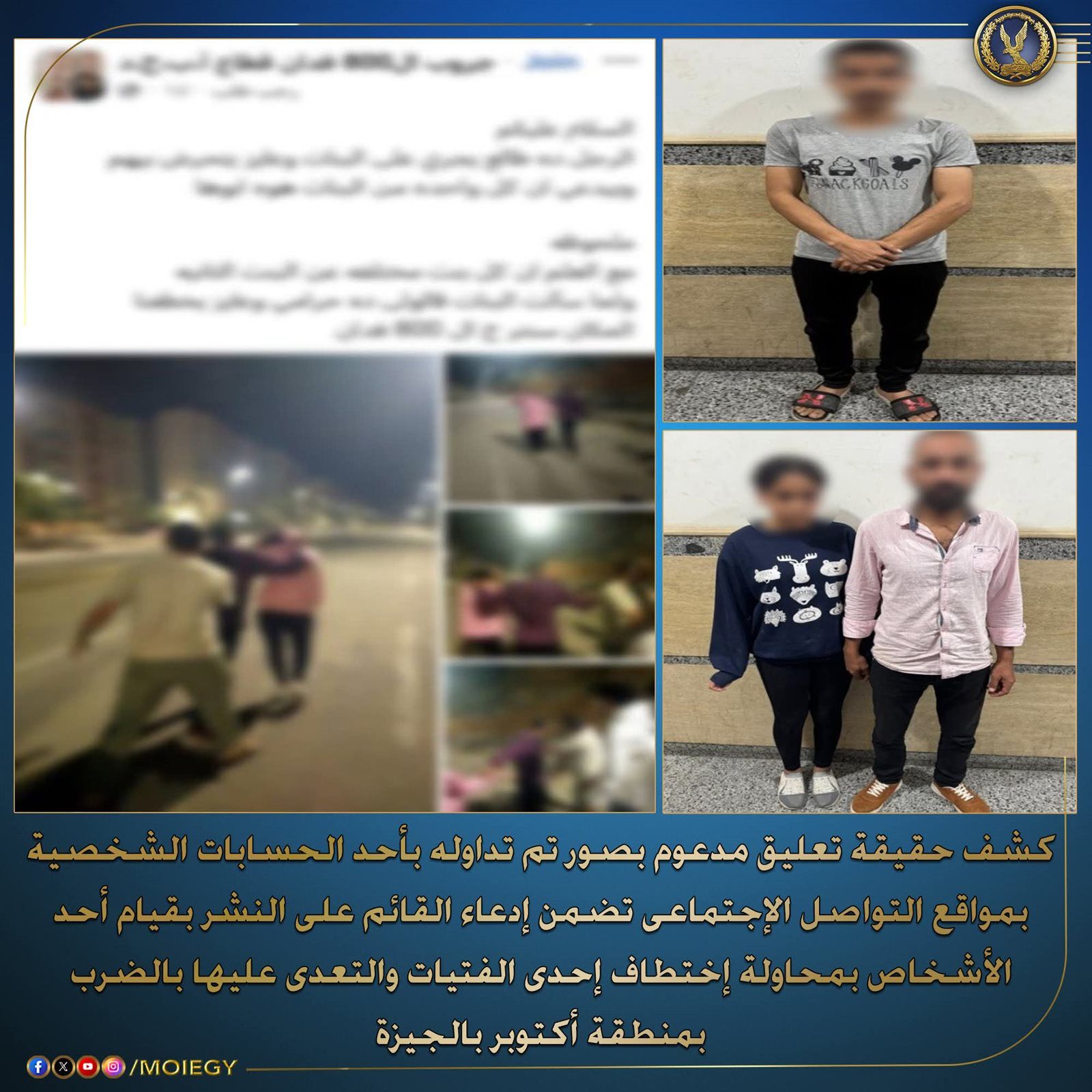 في إطار جهود وزارة الداخلية لكشف ملابسات ما تم تداوله عبر مواقع التواصل الاجتماعي، تمكنت الأجهزة الأمنية من كشف حقيقة منشور مدعوم بصور، تم تداوله على أحد الحسابات الشخصية، تضمن ادعاء قيام أحد الأشخاص بمحاولة اختطاف فتاة والتعدي عليها بالضرب بمنطقة أكتوبر بالجيزة.