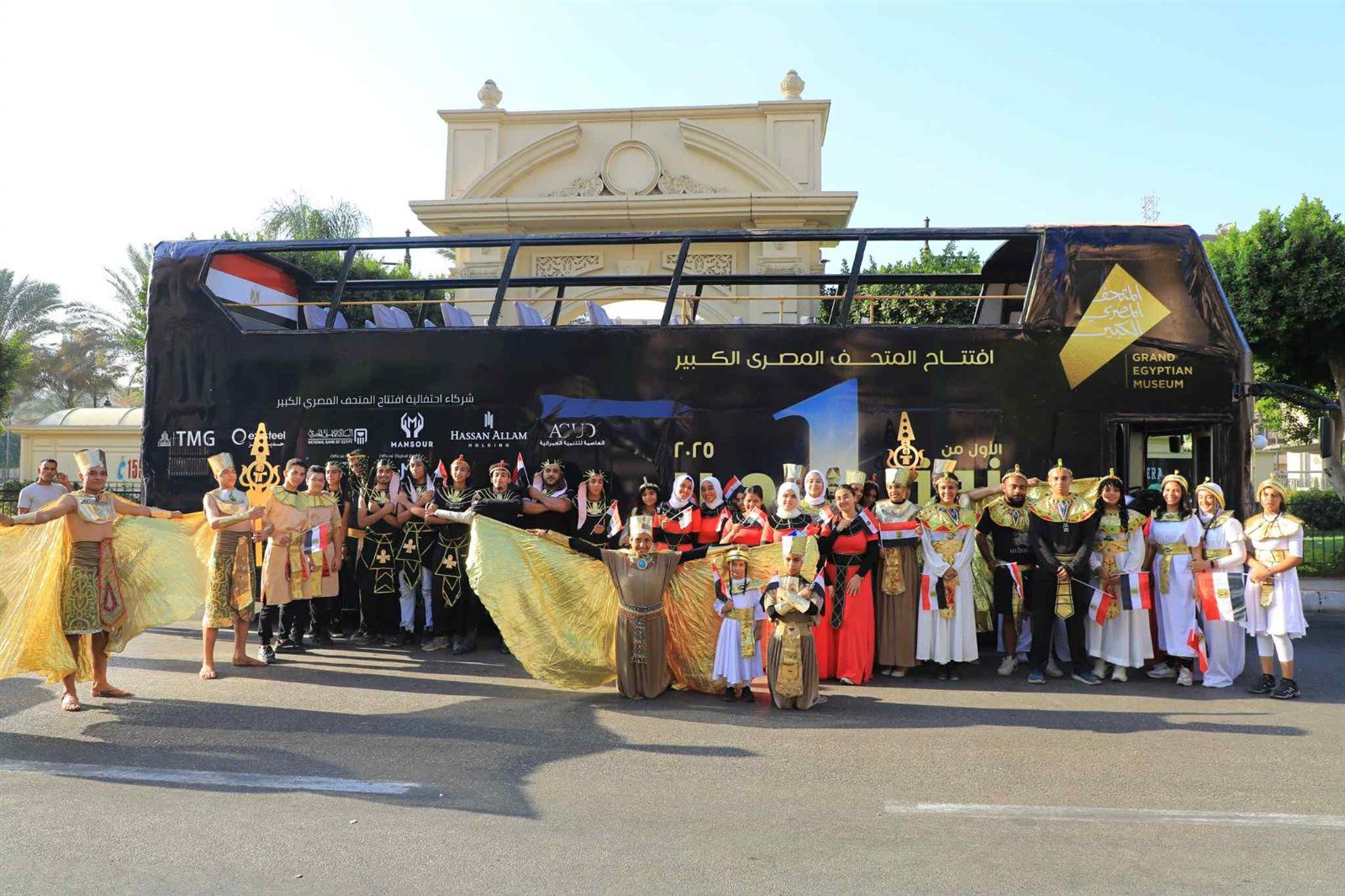 ويشارك فى جولات الأتوبيسات المفتوحة عدد من شباب وفتيات مراكز الشباب بالقاهرة يرتدون الزي الفرعونى، ويحملون أعلام مصر.