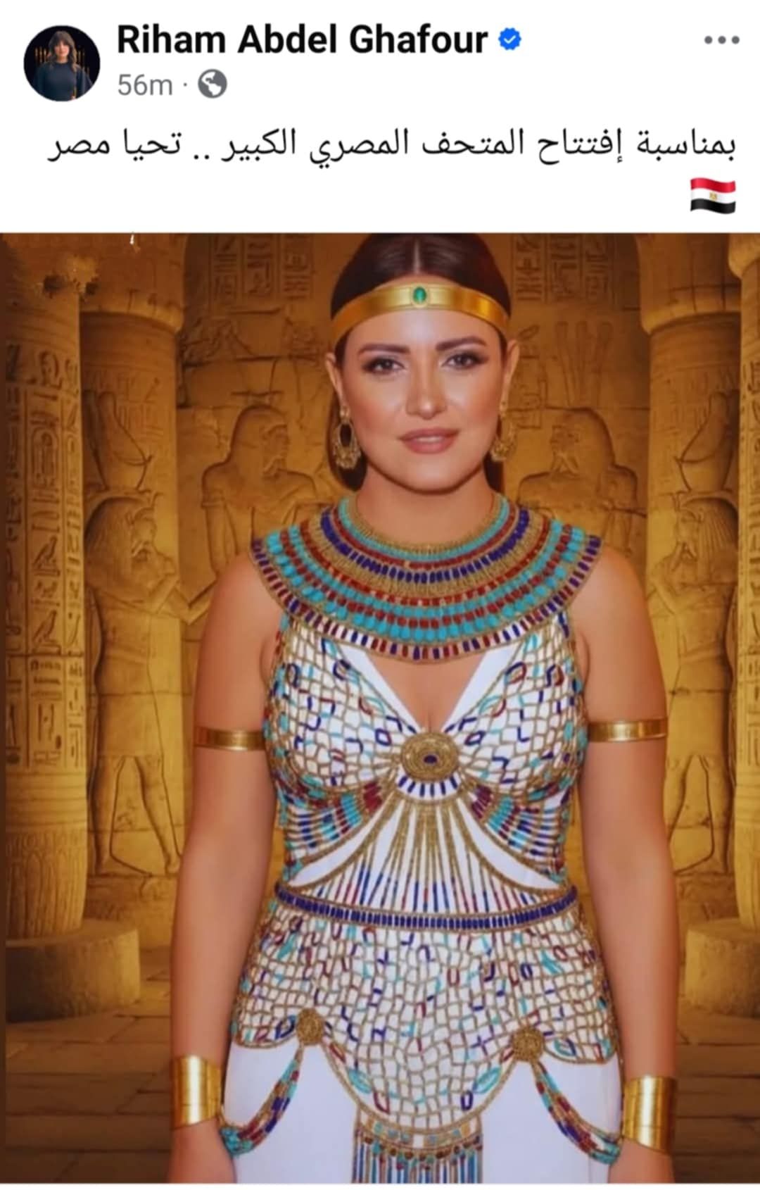 احتفلت الفنانة ريهام عبد الغفور مع جمهورها بمناسبة افتتاح المتحف المصري الكبير غداً، بصورة لها بالزي المصري القديم.