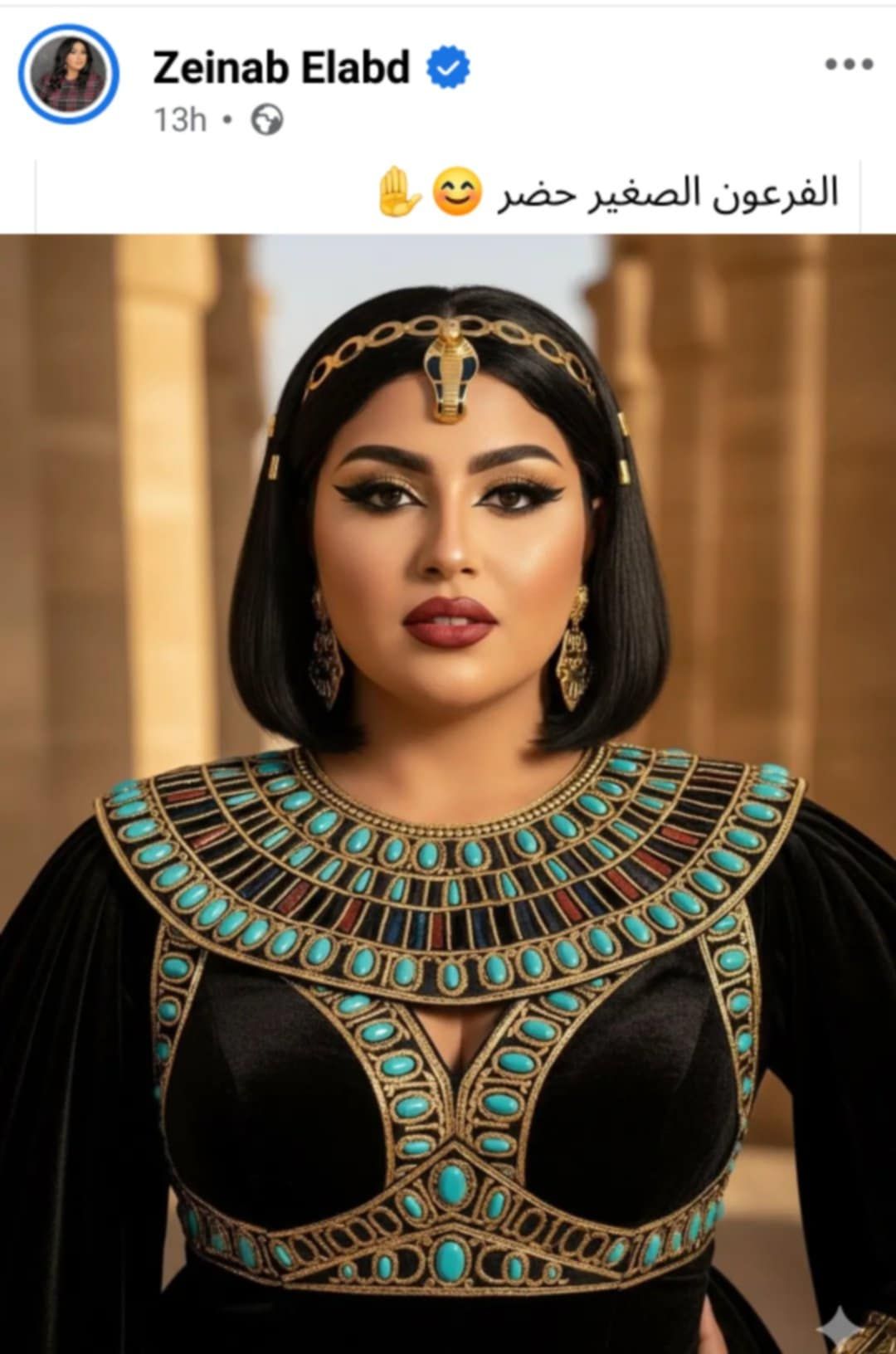 ونشرت الفنانة زينب العبد على صفحتها الشخصية على موقع التواصل الاجتماعي فيس بوك، منشور بصورة لها بالزي المصري القديم، ورسالة خاصة لتشارك بها جمهورها.
