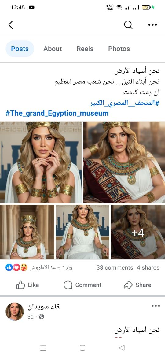 ونشرت سويدان عبر صفحتها الشخصية فيس بوك صورها لها بالزي الفرعوني المصري وعلقت عليها قائلة: "نحن أسياد الأرض، نحن أبناء النيل، نحن شعب مصر العظيم إن رمث كيمت #المتحف__المصري_الكبير".