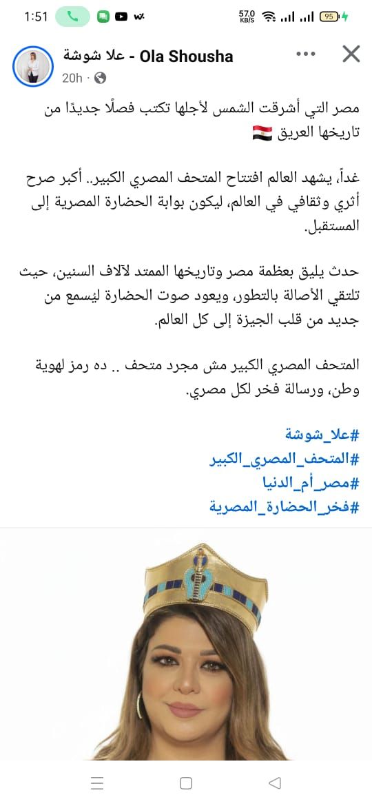 احتفلت الإعلامية علا شوشة بالحدث التاريخي الذي سوف يُفتتح خلال ساعات قليلة هو المتحف المصري الكبير، ونشرت شوشة عبر صفحتها الرسمية فيس بوك صورها لها بالزي الفرعوني المصري وعلقت عليها قائلة: “مصر التي أشرقت الشمس لأجلها تكتب فصلًا جديدًا من تاريخها العريق، يشهد العالم افتتاح المتحف المصري الكبير”.