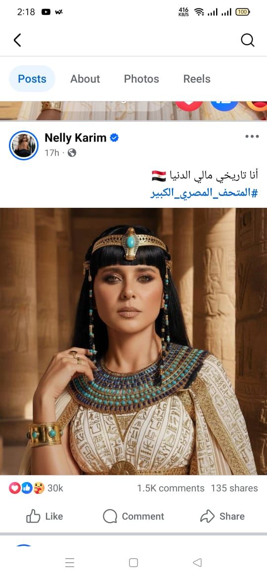 احتفلت النجمة نيللي كريم بافتتاح المتحف المصري الكبير، ونشرت عبر صفحتها الرسمية على موقع التواصل الاجتماعي “فيس بوك” صورها لها بالزي الفرعوني المصري وعلقت عليها قائلة: "أنا تاريخي مالي الدنيا".