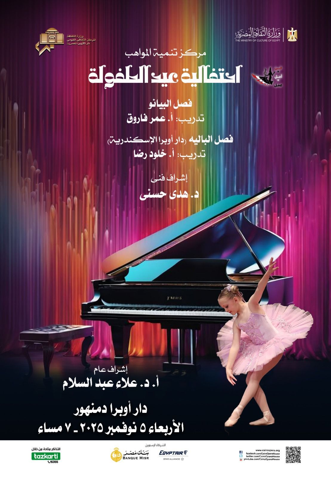 تواصل دار الأوبرا المصرية برئاسة الدكتور علاء عبد السلام، احتفالاتها بأعياد الطفولة والتى تأتى ضمن خطط وزارة الثقافة للإحتفاء بمختلف المناسبات الإجتماعية حيث تقام أمسية للدارسين بمركز تنمية المواهب فى أوبرا الأسكندرية ودمنهور بإشراف الدكتورة هدى حسنى وذلك فى السابعة مساء الأربعاء 5 نوفمبر على مسرح أوبرا دمنهور.
