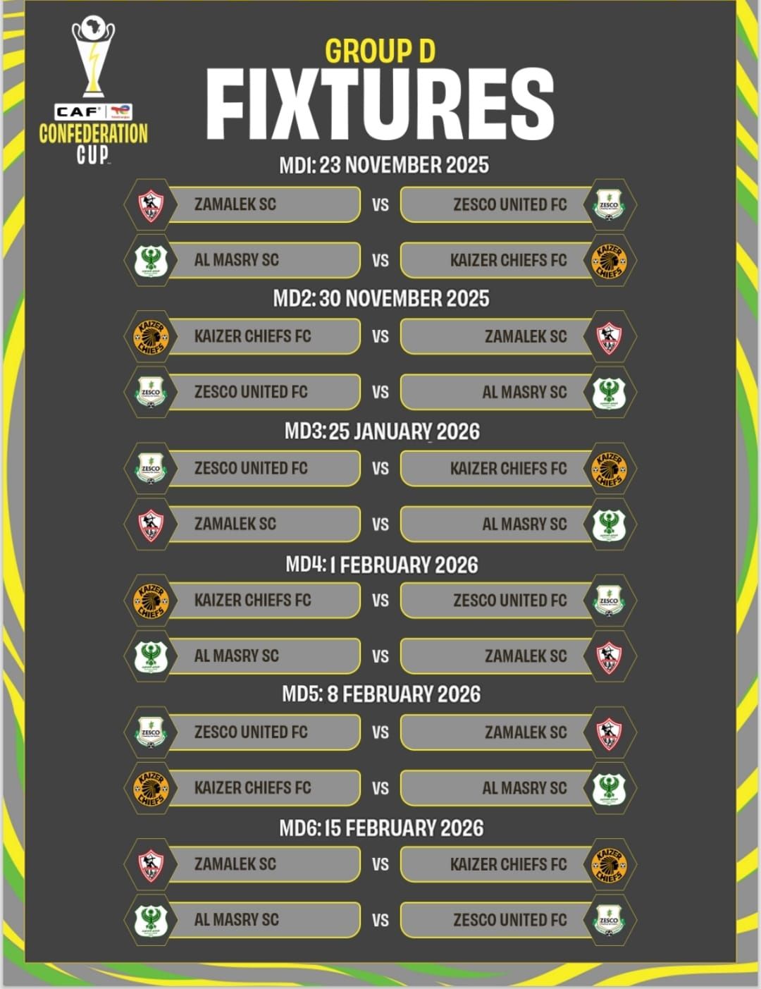 الجولة الثانية : ويلتقي خلالها المصري خارج أرضه مع مضيفه فريق زيسكو يونايتد الزامبي في الثلاثين من نوفمبر الجاري.
