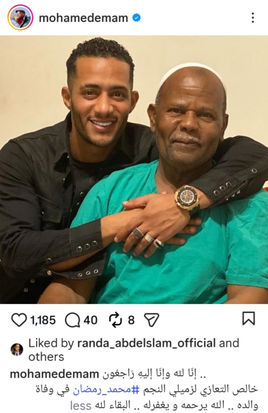 وعلق الفنان محمد إمام على الصورة "إن لله وإن إليه راجعون، خالص التعازي لزميلي النجم محمد رمضان في وفاة والده، الله يرحمه ويغفر له والبقاء لله".