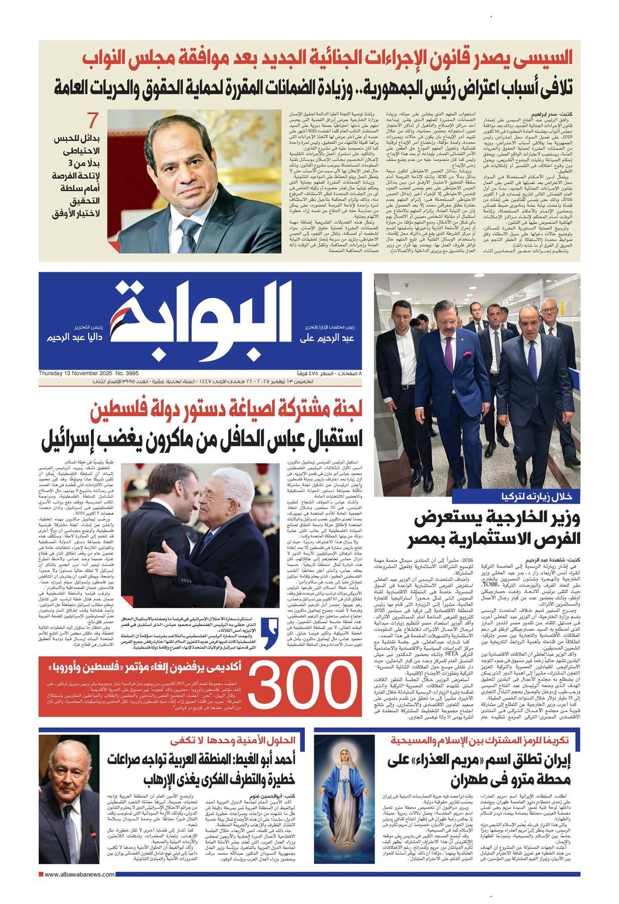 تقرأ غدًا في العدد الجديد من جريدة «البوابة»، الصادر بتاريخ الخميس 13 نوفمبر 2025، مجموعة من الموضوعات والانفرادات المهمة، ومنها: