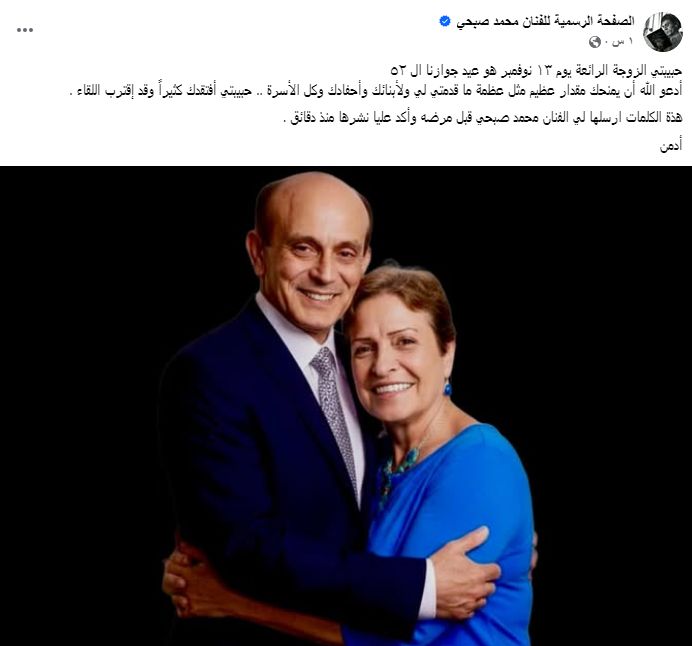 كشف الأدمن الخاص بالصفحة الرسمية للفنان الكبير محمد صبحي، أن النجم القدير كتب بنفسه كلمات مؤثرة قبل تعرضه لأزمته الصحية الأخيرة، طالبًا نشرها في ذكرى زواجه الثاني والخمسين.