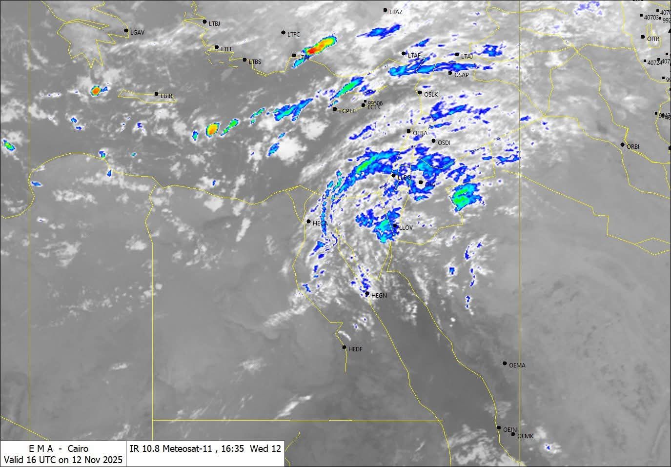 كشفت هيئة الأرصاد الجوية، أنه تشير أخر صور الأقمار الصناعية اليوم، إلى بداية نمو السحب المنخفضة والمتوسطة على مناطق من جنوب غرب القاهرة الكبرى ومحافظة الفيوم  قد يصاحبها سقوط أمطار ومن المتوقع تقدمها لباقى أنحاء القاهرة الكبرى مع تقدم الوقت.
