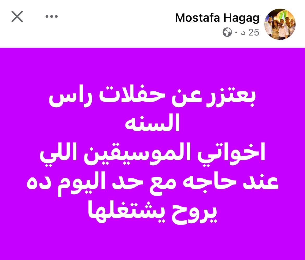 أعلن الفنان مصطفى حجاج عبر صفحته على "فيسبوك" اعتذاره عن إحياء حفلات رأس السنة من دون توضيح الأسباب، وكتب: "بعتذر عن حفلات رأس السنة.. إخواتي الموسيقيين اللي عنده حاجة مع حد اليوم ده يروح يشتغلها".