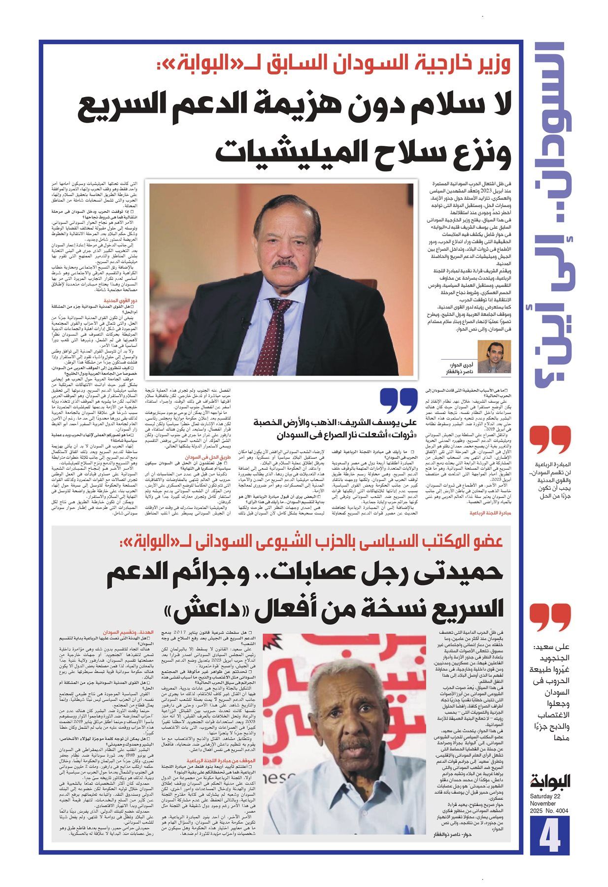 ويقدّم الشريف قراءة نقدية لمبادرة اللجنة الرباعية، ويتحدث بصراحة عن مخاوف التقسيم، ومستقبل العملية السياسية، وفرص الحسم العسكري، وشروط نجاح المرحلة الانتقالية إذا توقفت الحرب.