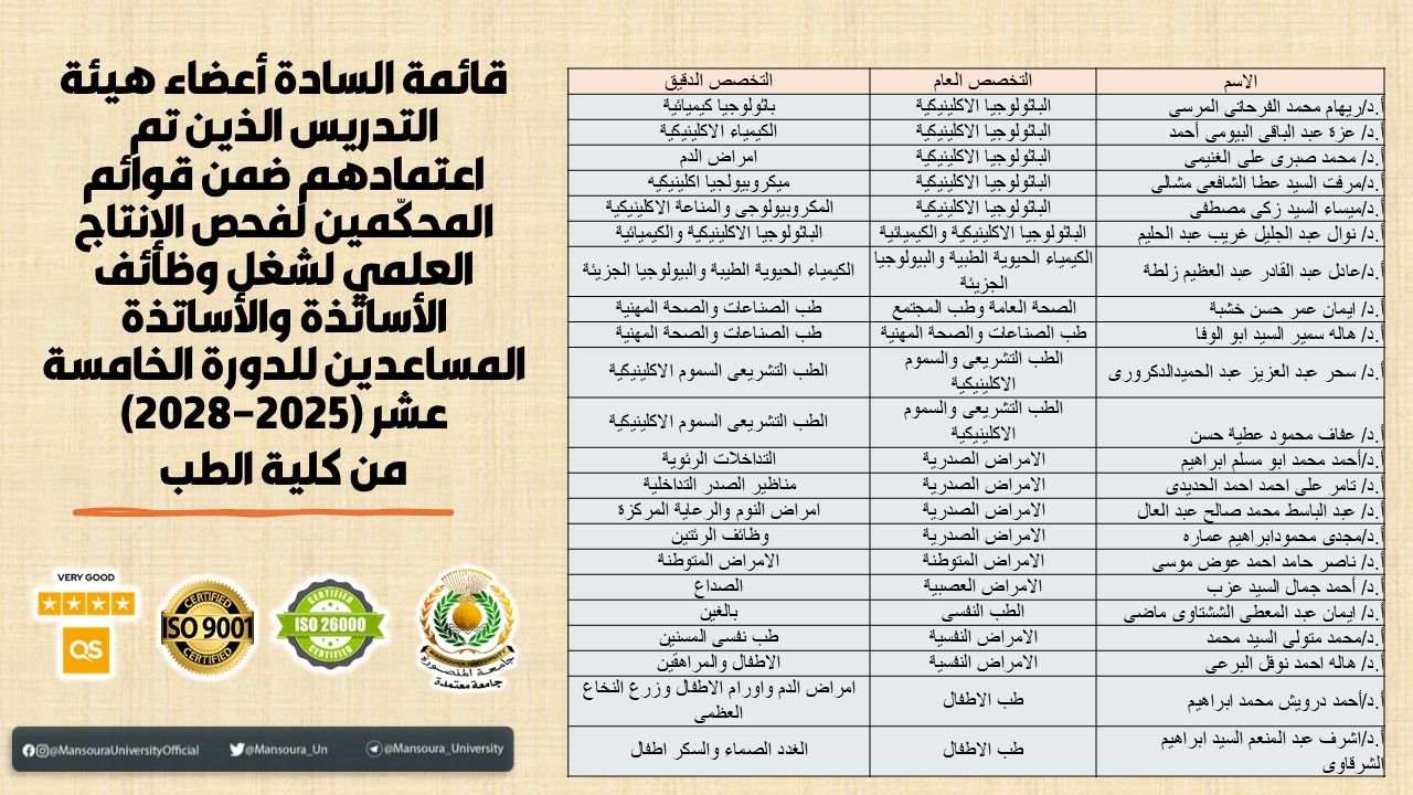 أعلن الدكتور شريف خاطر، رئيس جامعة المنصورة، انضمام 471 عضوًا من أعضاء هيئة التدريس بالجامعة إلى قوائم المحكّمين لفحص الإنتاج العلمي للمتقدّمين للترقية إلى درجتي الأستاذ والأستاذ المساعد بالجامعات المصرية، وذلك وفقًا للقوائم الصادرة عن المجلس الأعلى للجامعات للدورة العلمية الخامسة عشرة (2025 – 2028) حيث يعكس هذا العدد الكبير من المُمتحنين الأكاديميين مكانة جامعة المنصورة الرائدة في دعم منظومة البحث العلمي بمصر.