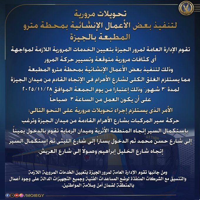 وأوضحت الوزارة أن تلك الأعمال تتطلب الغلق الكلي لشارع الأهرام في الاتجاه القادم من ميدان الجيزة لمدة ثلاثة أشهر، اعتبارًا من يوم الجمعة الموافق 28 نوفمبر 2025، على أن تبدأ الأعمال من الساعة الثالثة صباحًا.