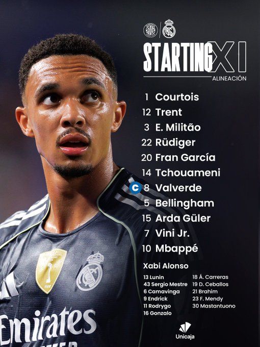 وجاء تشكيل النادي الملكي بقيادة المدير الفني تشابي ألونسو بتواجد عدد من النجوم منذ بداية اللقاء، وفي مقدمتهم الفرنسي كيليان مبابي والإنجليزي جود بيلينغهام والبرازيلي فينيسيوس جونيور.