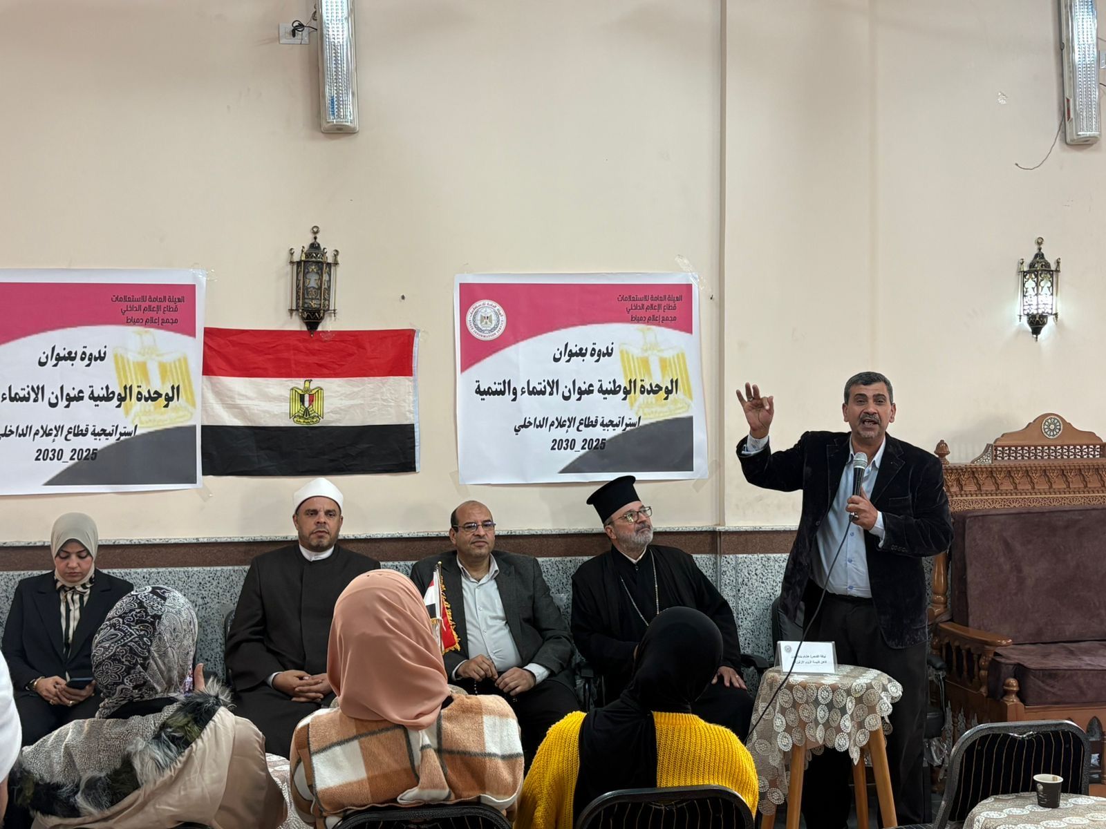 نظّم مجمع إعلام دمياط التابع لقطاع الإعلام الداخلي بالهيئة العامة للاستعلامات برئاسة الدكتور أحمد يحيى، ندوة تثقيفية بعنوان «الوحدة الوطنية… عنوان الانتماء والتنمية»، وذلك بالتعاون مع مديرية الأوقاف وكنيسة الروم الأرثوذكس، بقاعة دار المناسبات بمسجد البحر. في إطار تنفيذ إستراتيجية قطاع الإعلام الداخلي 2025–2030، برعاية الكاتب الصحفي الدكتور ضياء رشوان، رئيس الهيئة العامة للاستعلامات.