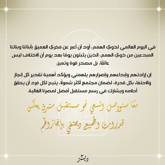 وقالت: في هذا اليوم، نحتفي بأبناء وطننا من أصحاب الهمم.. قلوب مليئة بالحب، وإرادة لا تعرف المستحيل.