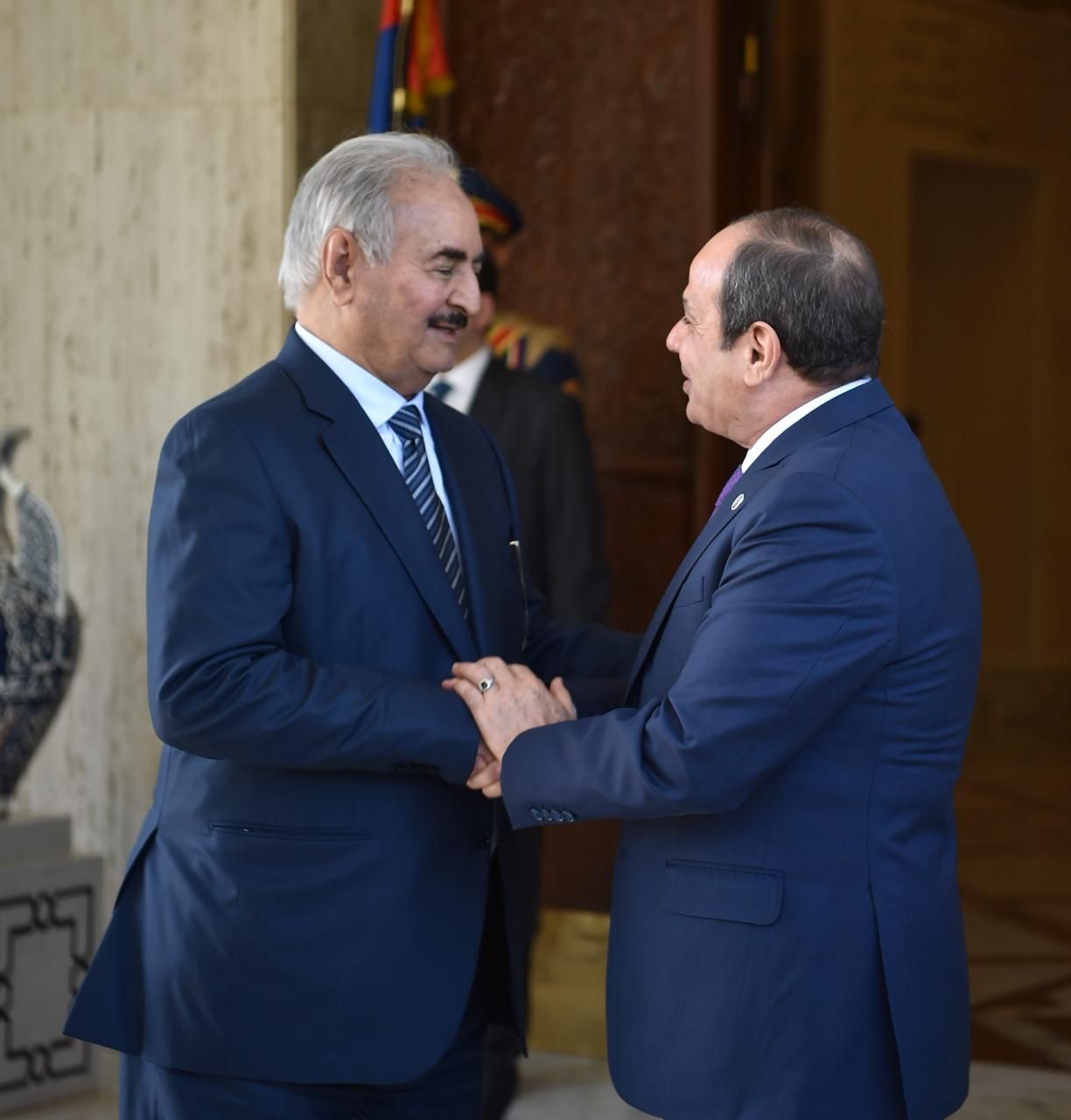 استقبل الرئيس عبد الفتاح السيسي، اليوم، المشير خليفة حفتر، القائد العام للجيش الوطني الليبي، وذلك بحضور اللواء حسن رشاد، رئيس المخابرات العامة، والفريق أول صدام خليفة، نائب القائد العام للجيش الوطني الليبي، والفريق أول خالد خليفة، رئيس الأركان العامة للجيش الوطني الليبي.