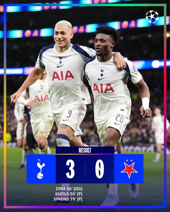 حقق توتنهام هوتسبير فوزًا كبيرًا على ضيفه سلافيا براج بثلاثة أهداف دون رد، في المباراة التي أقيمت مساء 9 ديسمبر 2025 ضمن منافسات الجولة السادسة من دور المجموعات لدوري أبطال أوروبا.