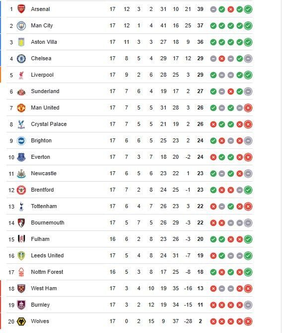 تصدر فريق أرسنال جدول ترتيب الدوري الإنجليزي الممتاز بعد انتهاء مباريات الأحد، محققًا 39 نقطة من 17 جولة، بفارق نقطتين عن مانشستر سيتي الذي حل في المركز الثاني برصيد 37 نقطة، ويعود تقدم أرسنال إلى انتصاراته المتتالية وأدائه القوي على ملعبه وخارجه خلال الفترة الأخيرة.