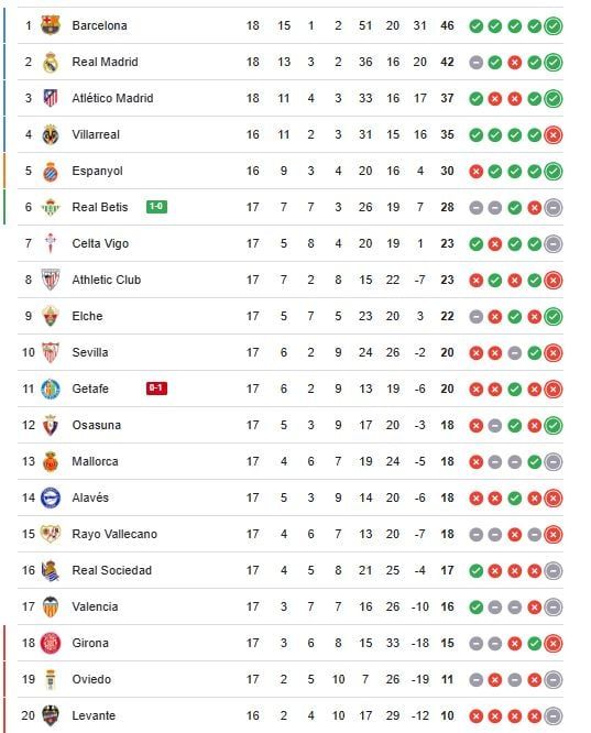 ويتصدر برشلونة جدول ترتيب الدوري الإسباني برصيد 46 نقطة، جمعها من 15 فوزًا وتعادل وحيد مقابل خسارتين، مسجلًا 51 هدفًا، بينما استقبلت شباكه 20 هدفًا، ليحافظ على فارق 4 نقاط مع غريمه التقليدي ريال مدريد صاحب المركز الثاني.