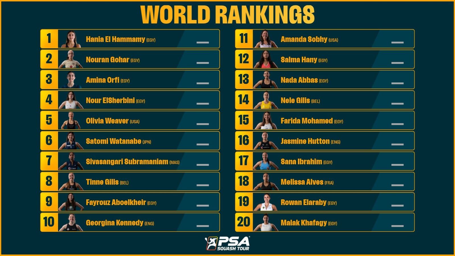 أعلنت رابطة اللاعبين المحترفين للاسكواش تصنيف الرجال والسيدات الجديد، اليوم الإثنين، عن موسم 2025-2026، وواصل المصري مصطفى عسل هيمنته على قمة ترتيب الرجال، كما واصلت البطلة المصرية هانيا الحمامي لاعبة وادي دجلة تربعها على قمة تصنيف السيدات.