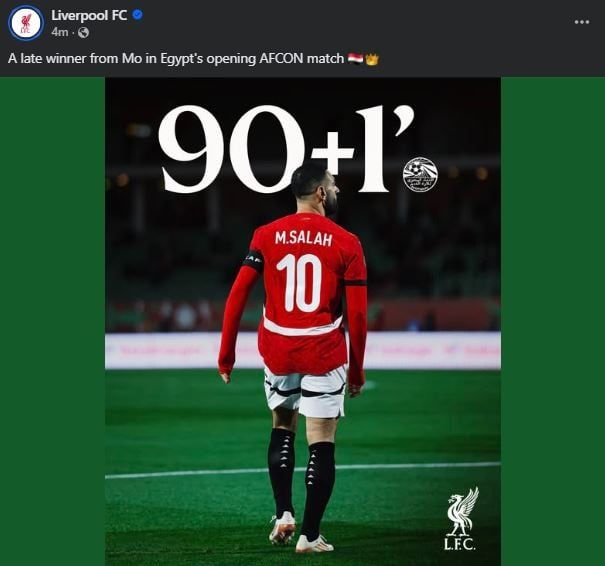 وسجل محمد صلاح هدف الفوز فى الدقيقة 91 من عمر المباراة التى كانت متجهة للتعادل، ليقود الفراعنة لأول فوز ويسجل الفرعون أول أهدافه فى أمم أفريقيا 2025، وكتب ليفربول عبر حسابه على فيسبوك: "هدف متأخر من محمد صلاح فى مباراة منتخب مصر الأولى فى كأس أمم أفريقيا" مع صورة لمحمد صلاح بقميص منتخب مصر.