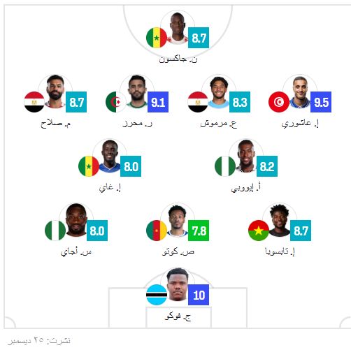 وشهدت التشكيلة المثالية للجولة الأولى التي كشفت عنها شبكة "سوفا سكور" المتخصصة في تقييم أداء اللاعبين، اليوم الخميس، الرباعي العربي محمد صلاح وعمر مرموش، إلى جانب النجم الجزائري رياض محرز، والتونسي إلياس العاشوري، بعدما قدموا مستويات مميزة وأسهموا بأدوار حاسمة مع منتخباتهم في الجولة الأولى.في المقابل، غاب أي لاعب مغربي عن التشكيل، رغم فوز منتخب المغرب على جزر القمر بهدفين دون مقابل في اللقاء الافتتاحي الذي أقيم السبت الماضي، ورغم التفوق الواضح للمنتخب المغربي على مجريات المباراة، إلا أن الأداء الجماعي طغى دون بروز فردي لافت، وهو ما انعكس على اختيارات التشكيل المثالي.وكان تألق رياض محرز وإلياس العاشوري أكثر بروزًا، بعدما سجل كل منهما هدفين، ليساهما بقوة في انتصار الجزائر على السودان، وتونس على أوغندا على الترتيب، ليتصدر المنتخبان مجموعتيهما مع نهاية الجولة الأولى.ويقود الخط الأمامي في التشكيل المثالي مهاجم منتخب السنغال نيكولاس جاكسون، الذي سجل هو الآخر ثنائية، أسهمت في الفوز العريض لمنتخب بلاده على بوتسوانا، ومنحت "أسود التيرانجا" بداية مثالية في مشوارهم بالبطولة.