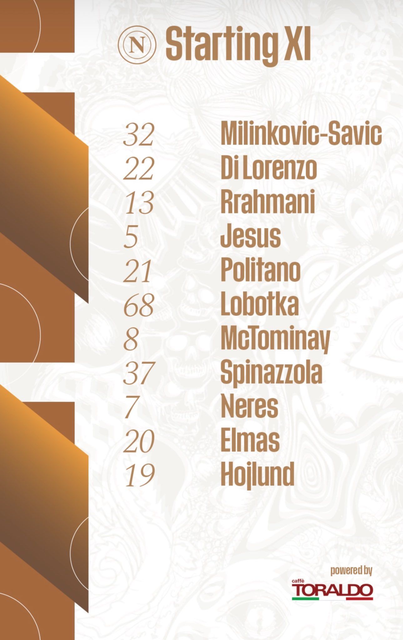 نيكيتا كونتيني في حراسة المرمى، ثم دي لورينزو، رحماني، جيسوس، بوليتانو، لوبوتكا، ماكتوميناي، سبينزولا، نيريس، إليف إلماس، وهويلوند.
